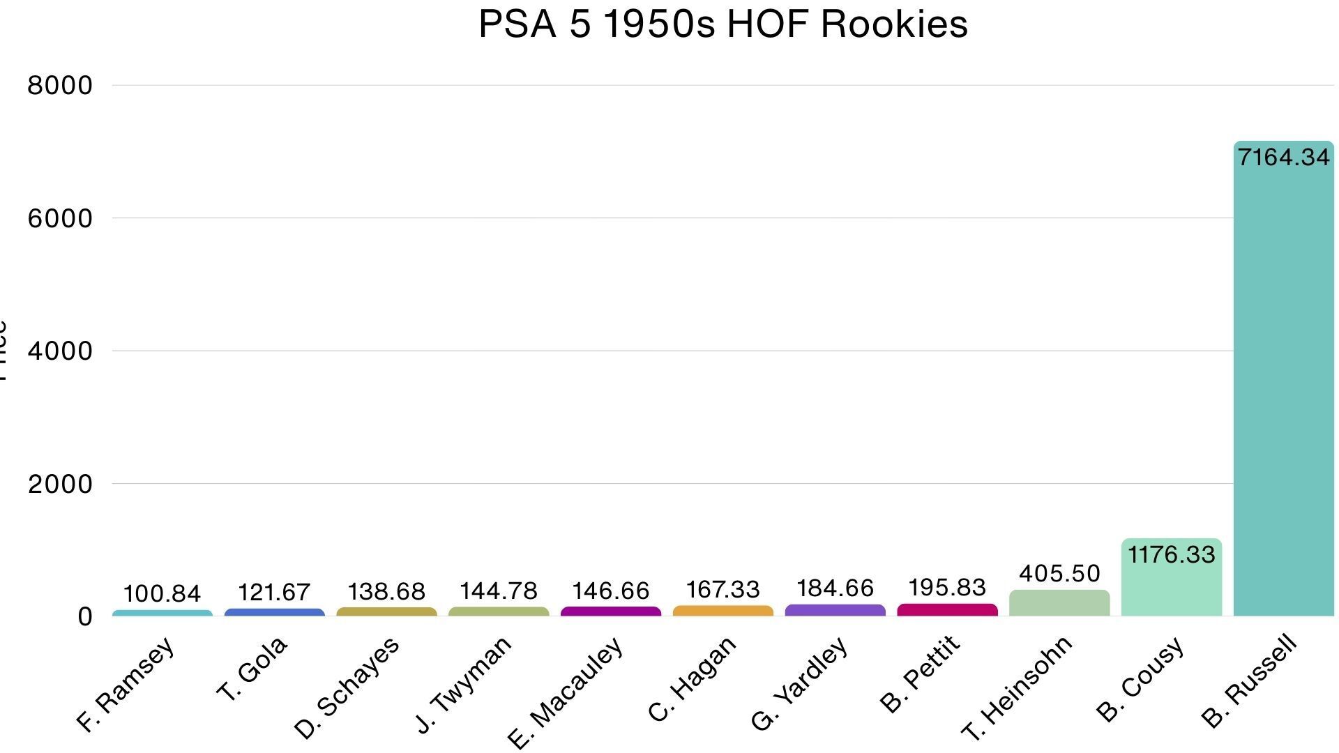 Russell’s rookie card managed to very much skew the average price of the group, which landed at $510.86. Perhaps not surprisingly based on their dominance from the late ‘50s throughout the ‘60s, the top three rookies are all Boston Celtics - and they have 81.5% of this group’s value.