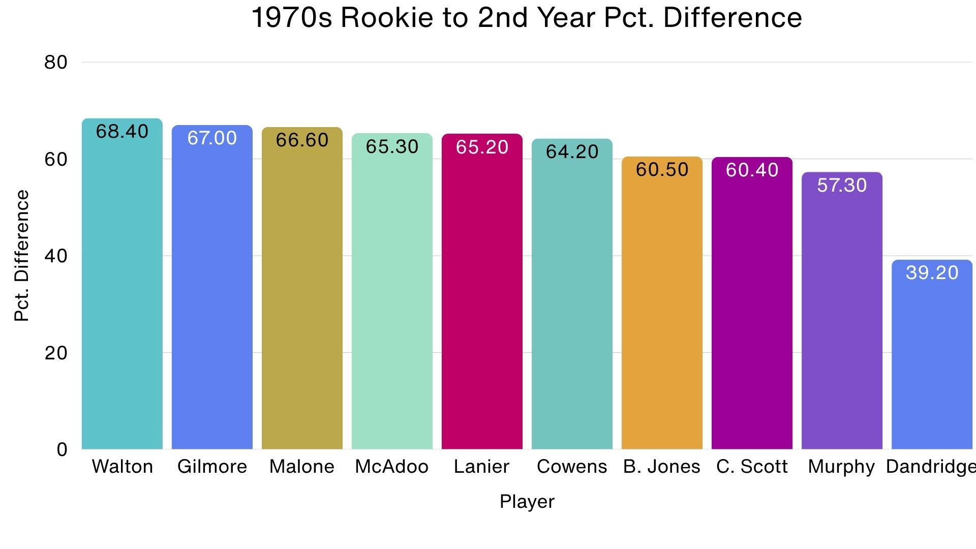 When it comes to individual cards, 14 of the 20 players had their rookie to second-year percentages increase as the grade got higher, Calvin Murphy leading the way with a 22.5% increase (from 57.3% for collector-grade to 79.8% for PSA 8s). Meanwhile, the biggest decrease belongs to Bob Lanier with -7.8%.